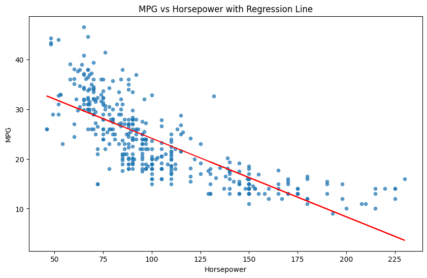 ax.set_title("MPG vs Horsepower with Regression Line")