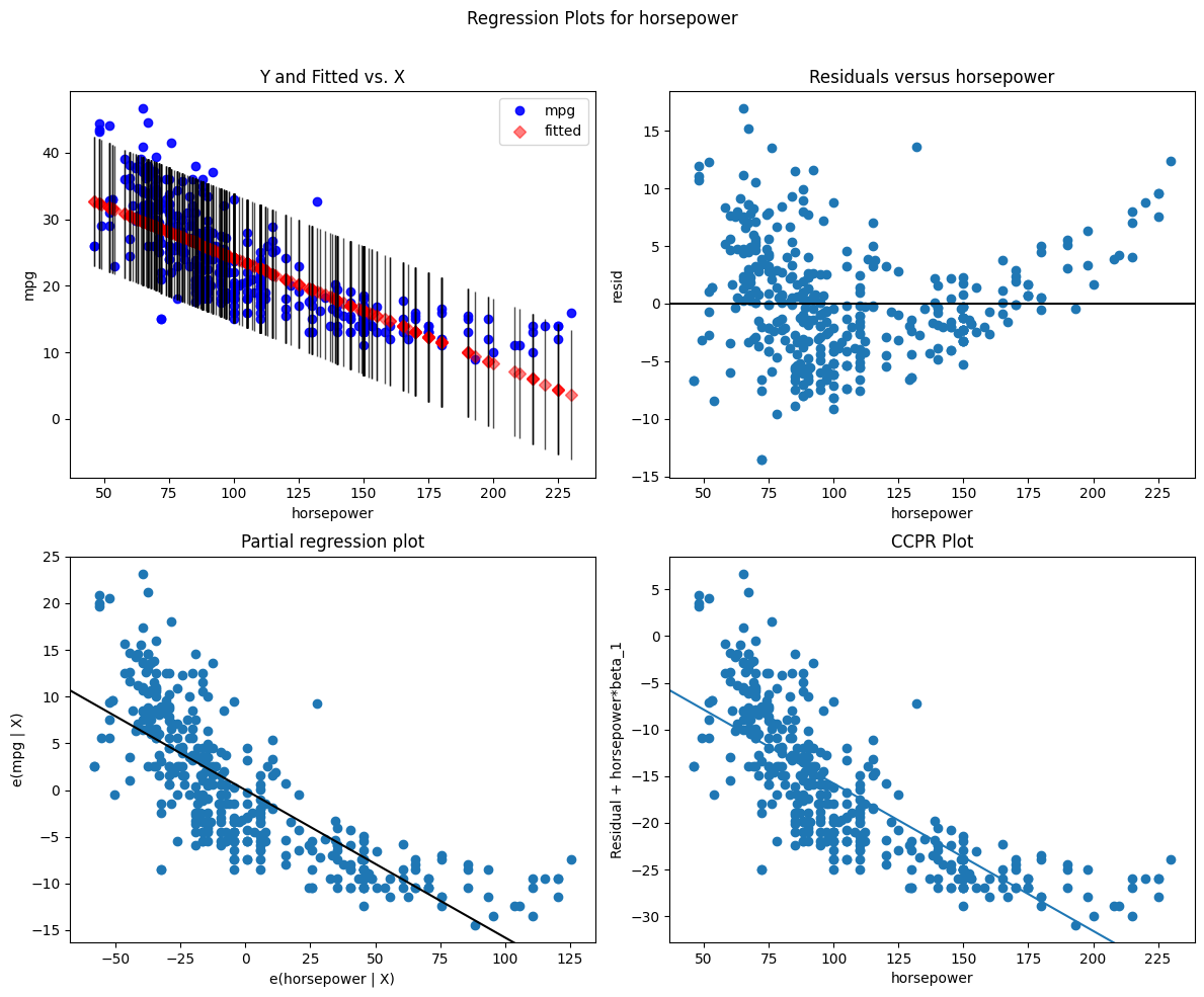 sm.graphics.plot_regress_exog(model_simple, "horsepower", fig=fig)